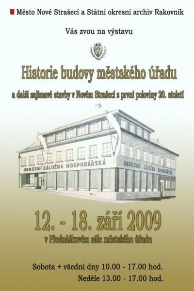 Výstava pod názvem Historie budovy městského úřadu a další zajímavé stavby v Novém Strašecí se uskuteční od 12. do 18. září 2009 v prostorách Přednáškového sálu budovy Městského úřadu.