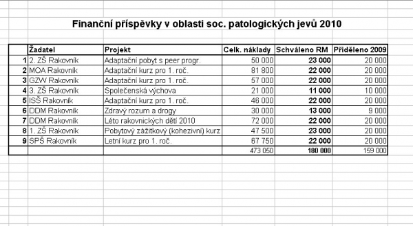 Rada města rozhodla poskytnout jednotlivým žadatelům o přidělení finančního příspěvku na základě doporučení odboru sociálních věcí a zdravotnictví a vyjádření komise SPOD (sociálně – právní ochrana dětí) finanční příspěvky na rok 2010 do 50.000,- Kč v oblasti sociálně patologických jevů v celkovém objemu 180.000,- Kč v souladu s předloženým návrhem.